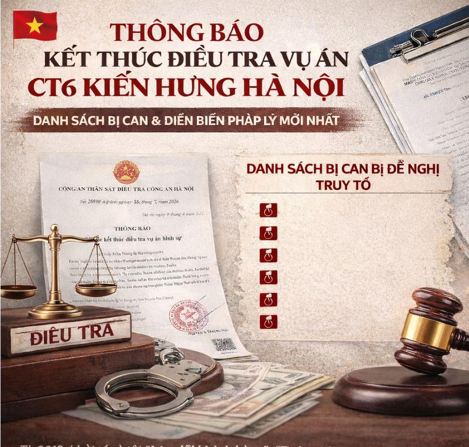 Ngày 09/04/2026, Cơ quan Cảnh sát điều tra – Công an TP Hà Nội ban hành Thông báo số 25688/TB-VPCQCSĐT về việc kết thúc điều tra vụ án hình sự xảy ra tại dự án CT6 Kiến Hưng (phường Kiến Hưng, quận Hà Đông).