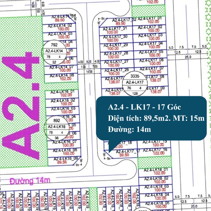 Lô A2.4 LK17-17 là lô góc hiếm có trong phân khu A2.4, sở hữu hai mặt tiền rộng thoáng. Vị trí lô góc giúp tầm nhìn mở, không gian sống thoáng sáng, đồng thời thuận tiện bố trí kiến trúc, sân vườn, ban công hoặc kinh doanh nhỏ ngay tại nhà. Lô góc thường có tỷ lệ thanh khoản cao hơn, đáp ứng nhu cầu mua ở thực và đầu tư.