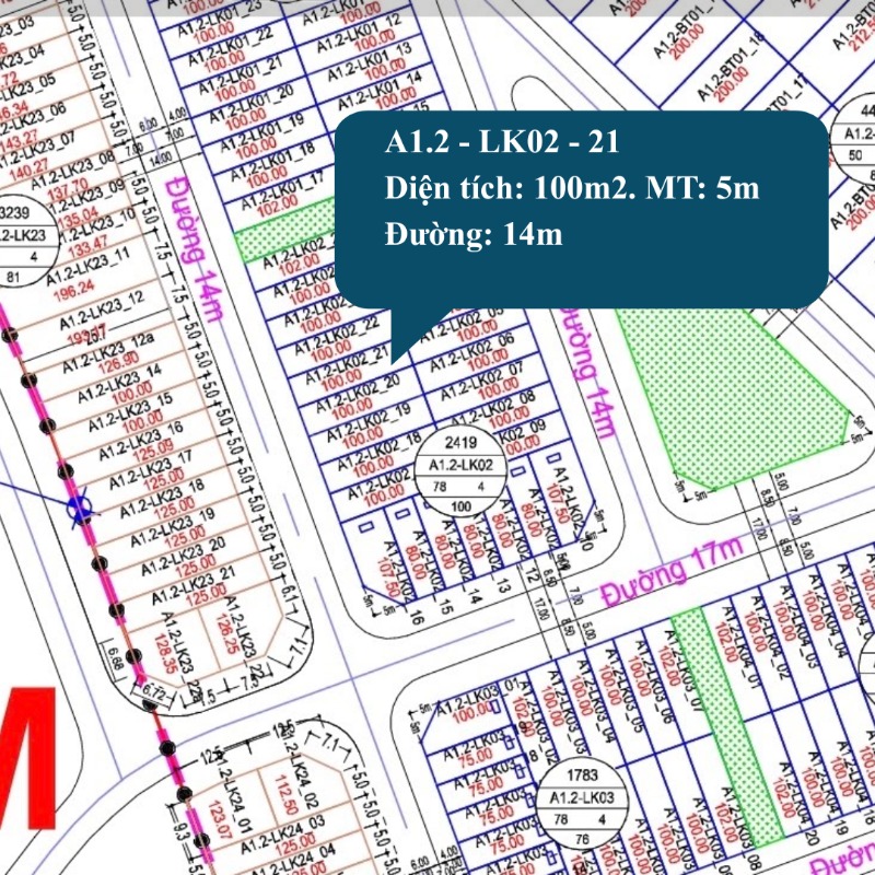 Khu đô thị Thanh Hà Cienco5 đang bước vào giai đoạn phát triển mạnh mẽ, khi hạ tầng, tiện ích và dân cư phủ kín ngày càng nhanh. Trong bức tranh đó, lô liền kề A1.2 – LK02 – 21, diện tích 100m², nằm trên mặt đường 14m của khu A – được xem là lựa chọn lý tưởng cho cả khách hàng ở thực và nhà đầu tư dài hạn đang tìm kiếm vị trí đẹp, quy hoạch chuẩn và giá trị tăng trưởng bền vững.