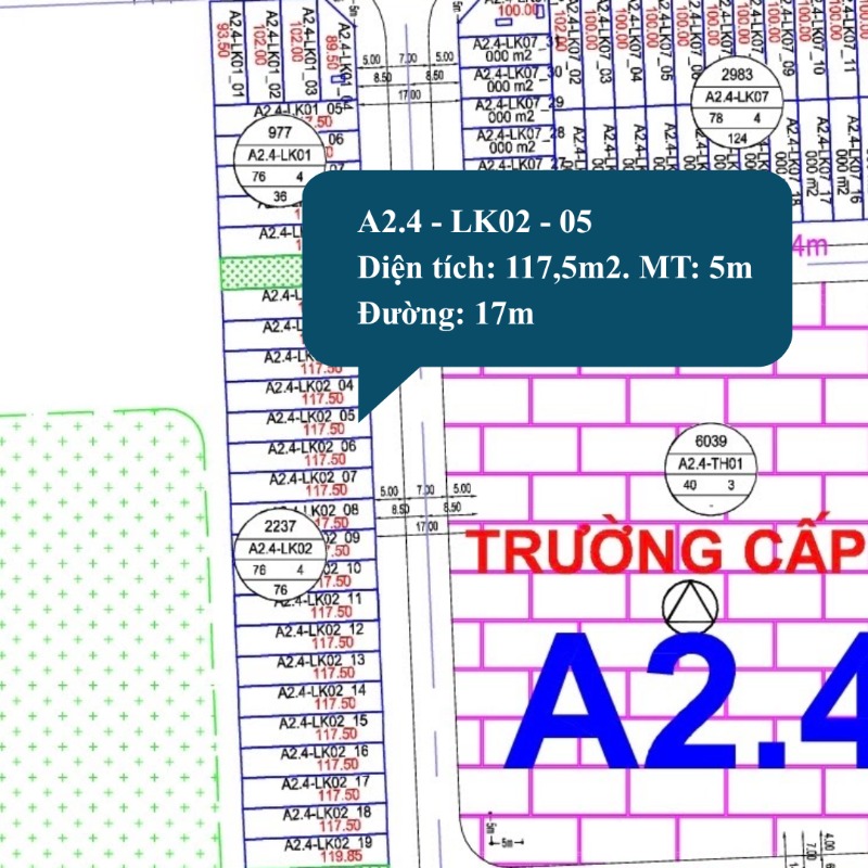 Theo khảo sát thực tế, giá liền kề khu A2.4 đang có xu hướng tăng ổn định theo từng quý, nhất là các lô có đường 17m trở lên, nhờ nguồn cung khan hiếm và nhu cầu thực tế cao. Với diện tích 117,5m², lô LK02-05 phù hợp để Chủ đầu tư xây nhà 2 mặt thoáng, dễ khai thác cho thuê hoặc bán lại trong chu kỳ 2026–2027.