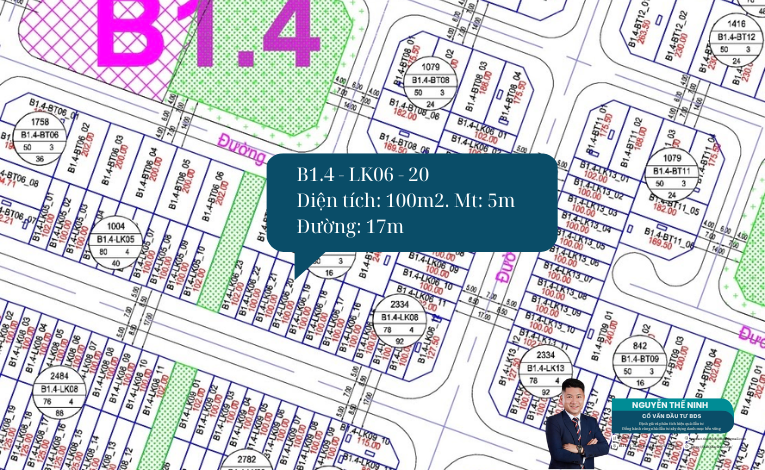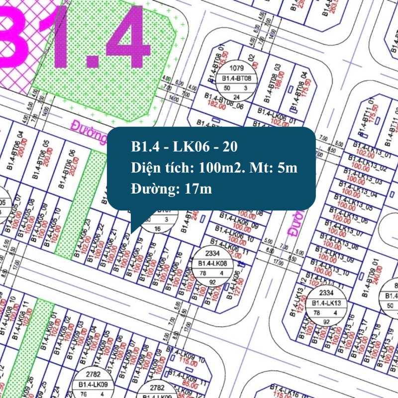 - · Lô B1.4 LK06-20 thuộc tuyến đường 17m ưu điểm vỉa hè rộng đỗ xe tiện lợi, vị trí gần ngã tư thông thoáng
